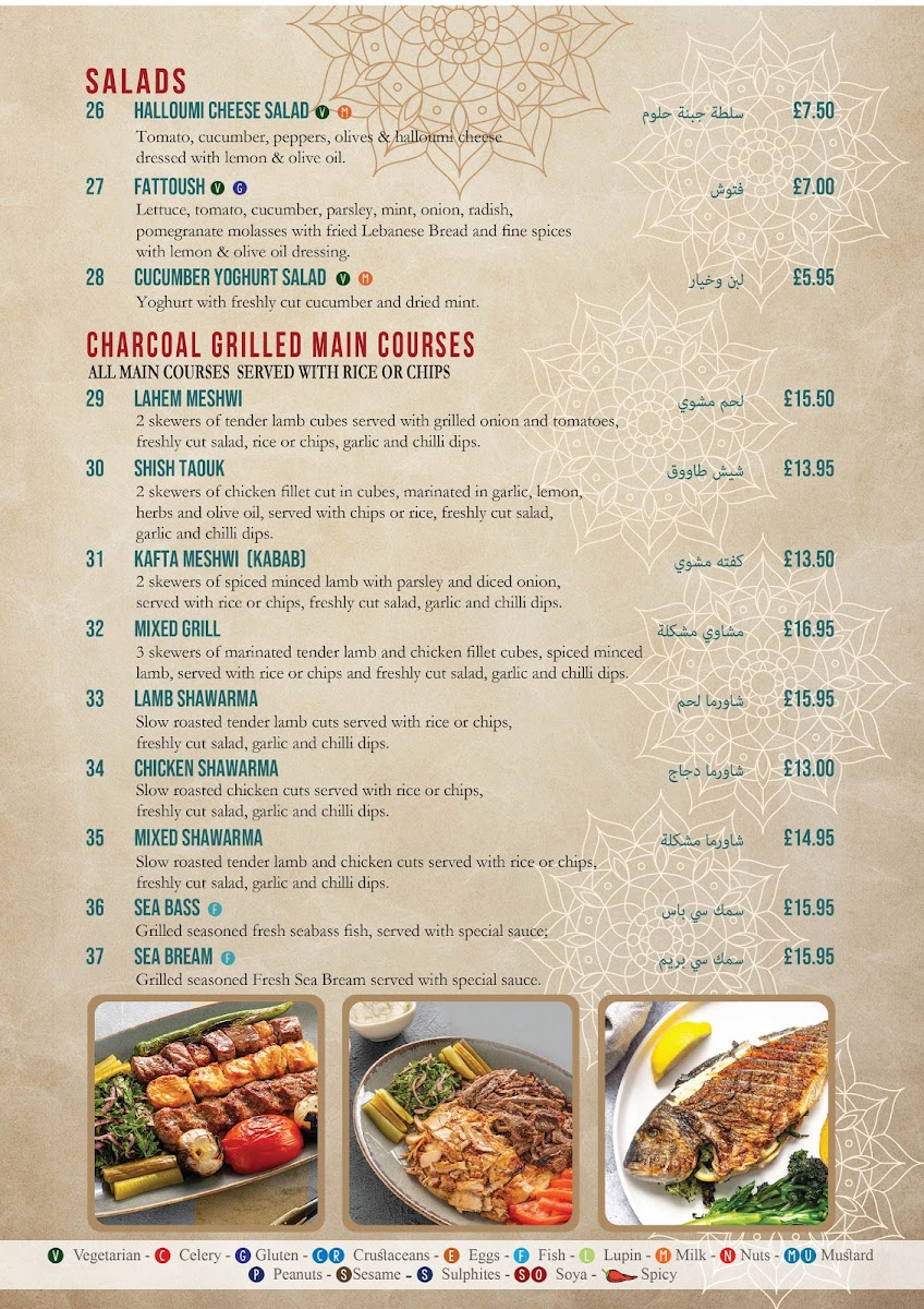 Salads include options such as Halloumi Cheese Salad, Fattoush, and Cucumber Yoghurt Salad, providing fresh and light choices.