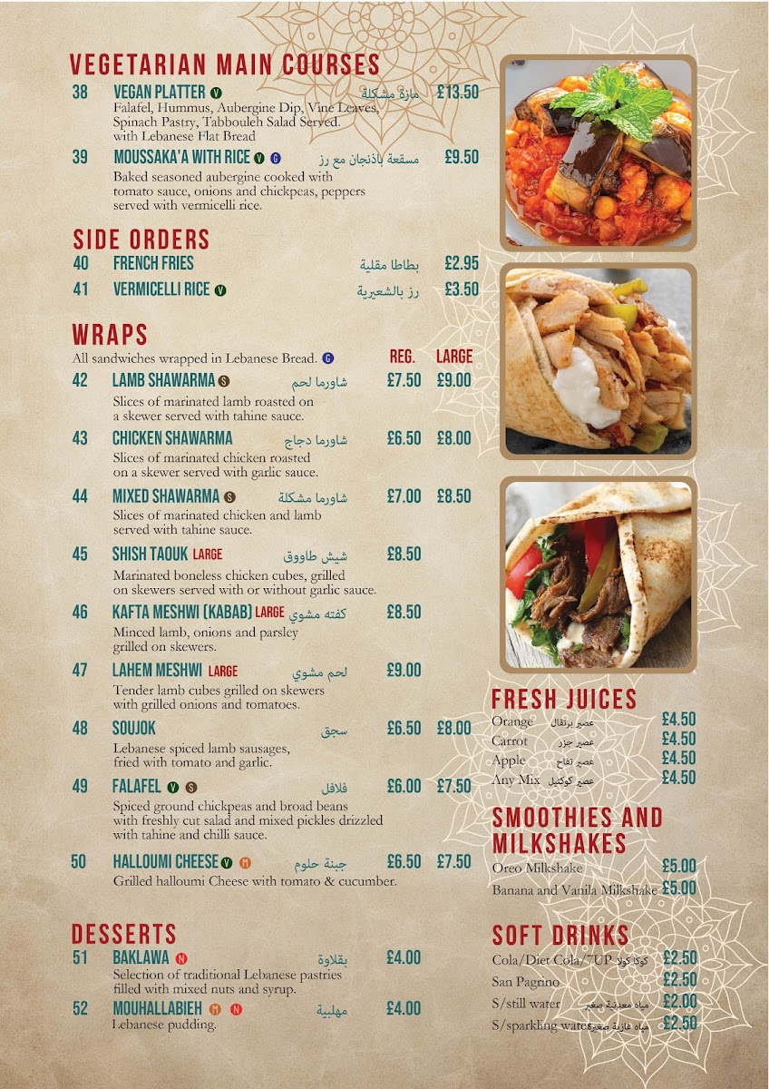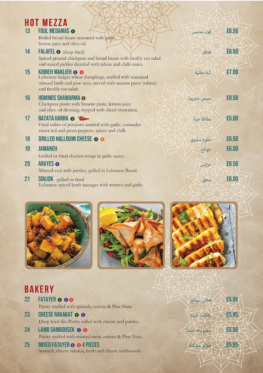 Appetizers and Dips include traditional items such as Hummus, Babaganoush, and Batata Harra.